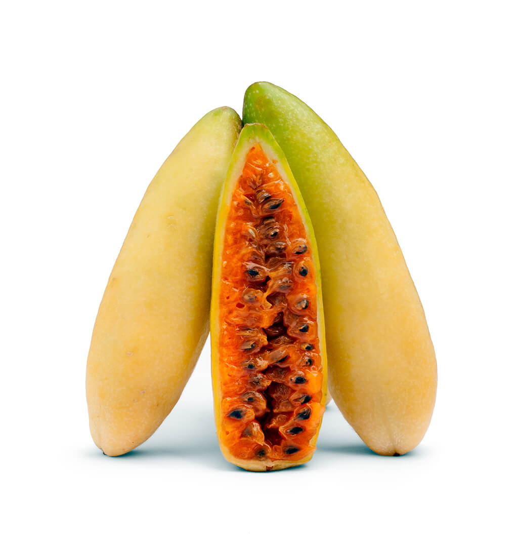 Curuba is a fruit native to the Andean valleys of Venezuela, Colombia, Peru and Bolivia. It is one of the more than 30 species of passionflower. The fruit is an oblong orange-yellow berry when ripe, very fragrant and elliptical. The pulp is firm, fleshy and with small black seeds. The color of the pulp is yellow or orange.